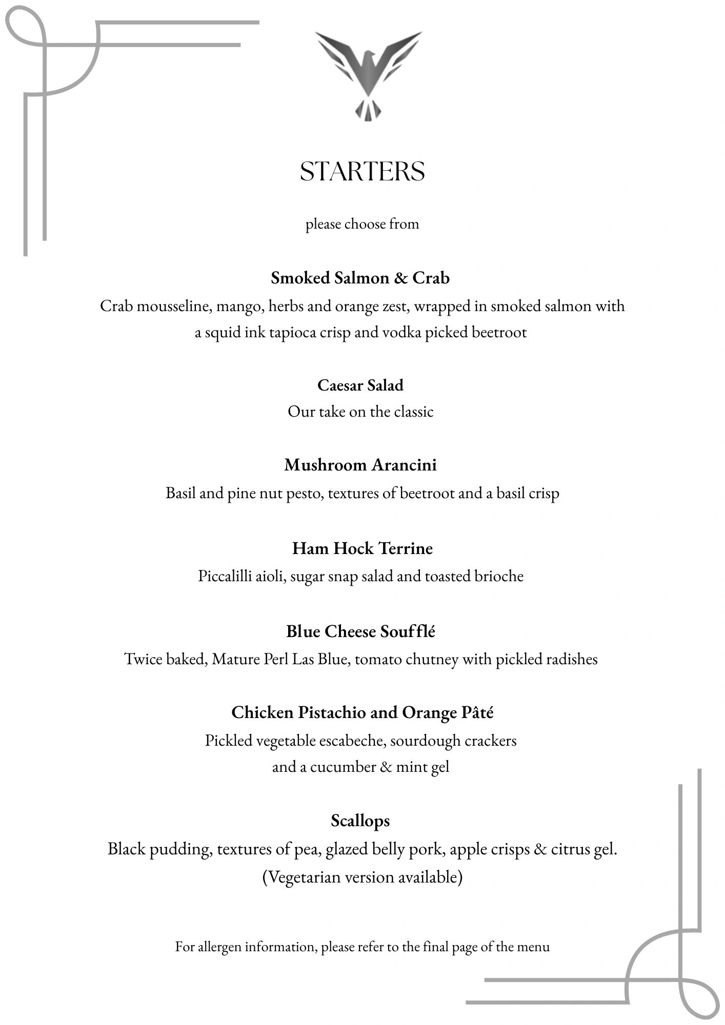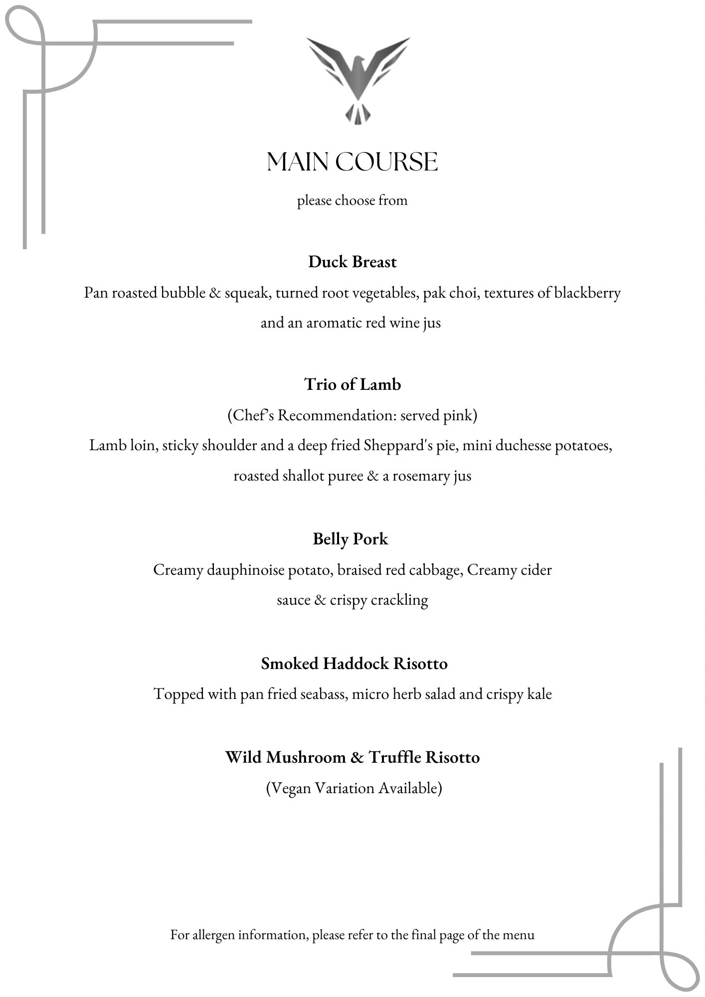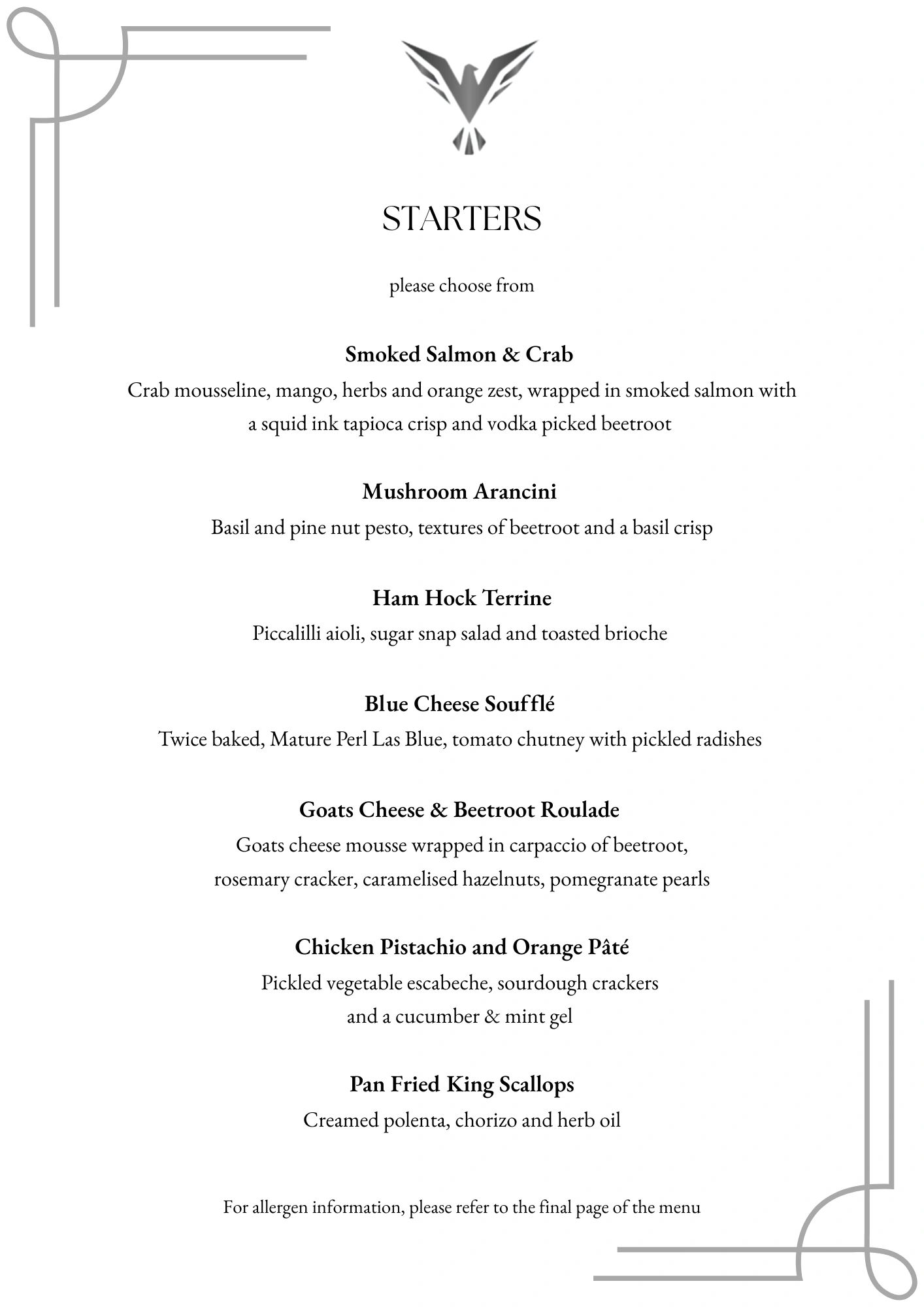 Should you have any allergen's or intolerances please highlight them on your reservation and please do inform our staff on arrival.